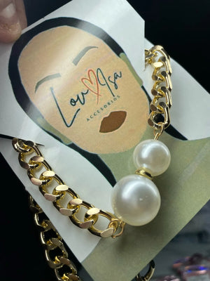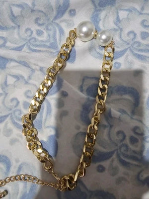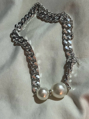 The pearl pendant adds a subtle refinement that reads polished in photos and in person, giving a high-end contrast to the punk Cuban links.